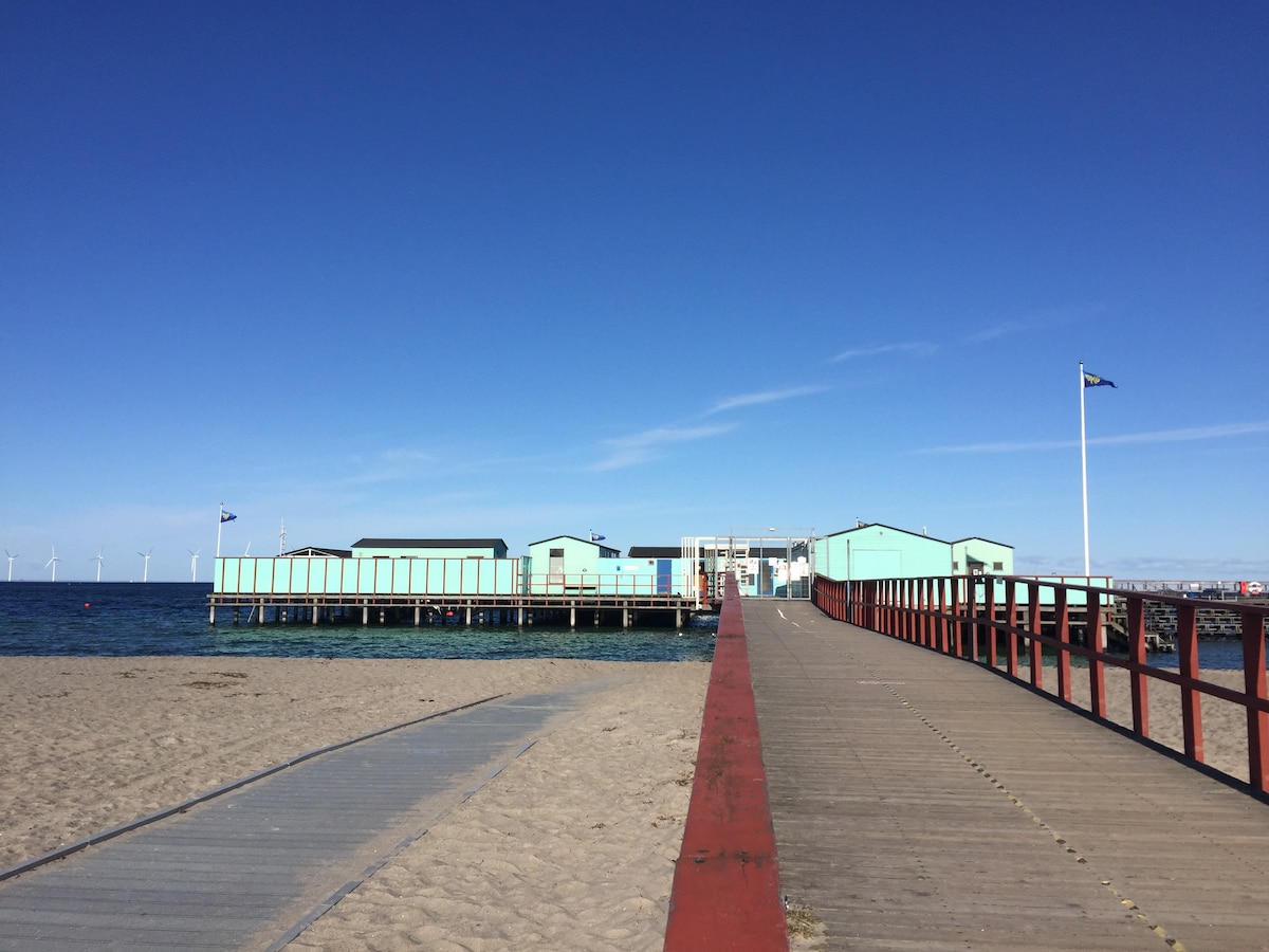 Rumah kecil tersembunyi di halaman belakang kami dengan ruang letak kereta percuma anda sendiri Dalam jarak yang dekat, anda akan menemui pantai berpasir, padang golf, kedai runcit, kedai roti tempatan. Perhentian bas juga berjarak 2 minit berjalan kaki jika anda ingin mengembara ke bandar atau Copenhagen dengan pengangkutan awam. Tuala, cadar dan sewaan dua basikal termasuk dalam harga.