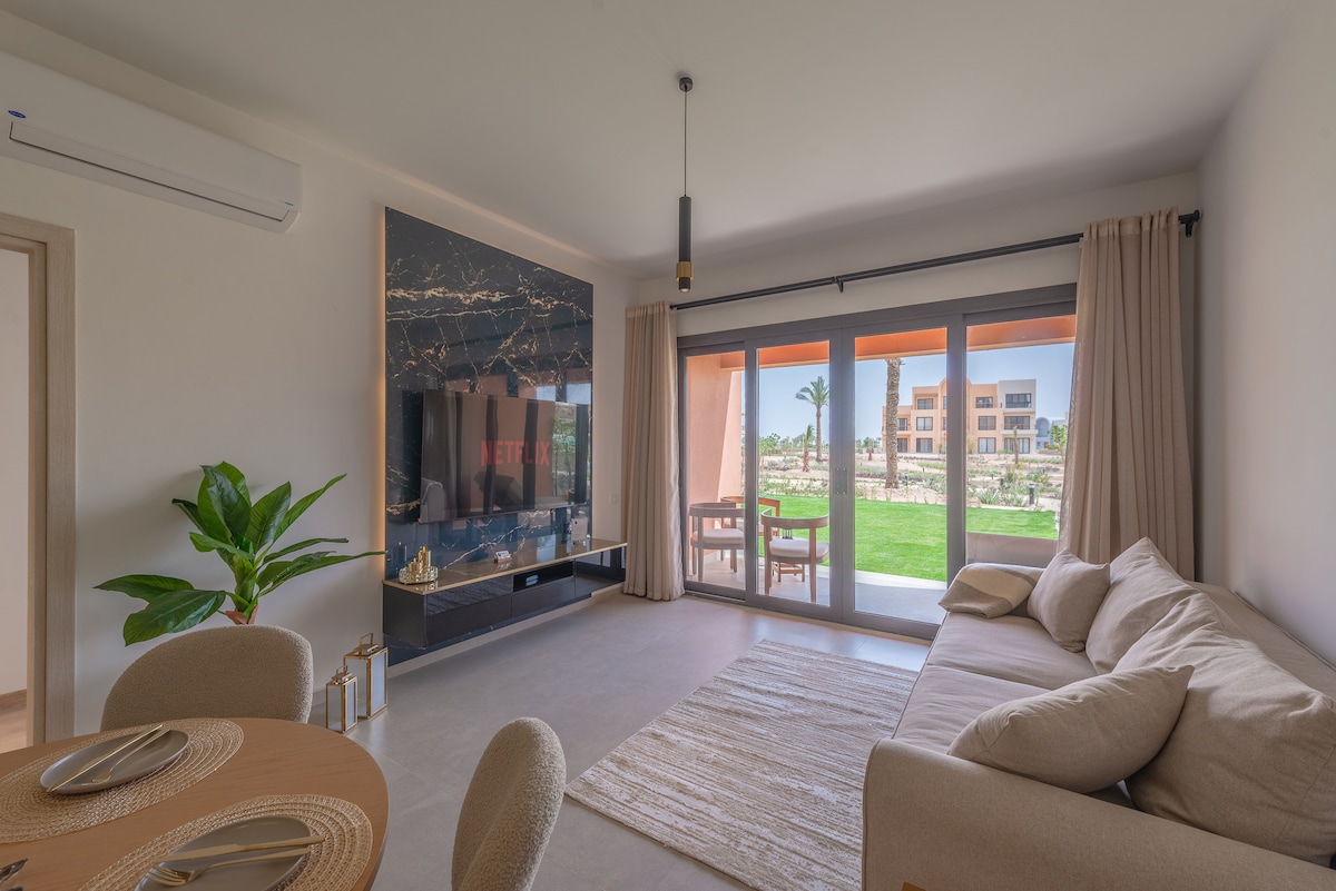 Boho Chic 1BR baharu di Ancient Sands Resort & Residences, El Gouna. Terletak di komuniti Fairways dalam Ancient Sands, terus di padang golf 18 lubang yang direka oleh Karl Litten (Lubang 10), dengan pemandangan lagun yang indah. Apartmen ini mempunyai ruang tamu yang cerah dan selesa, dapur terbina dalam moden, bilik mandi en-suite serta bilik solek tetamu, dan teres cerah persendirian yang besar dengan pemandangan matahari terbit yang menakjubkan di atas lagun.