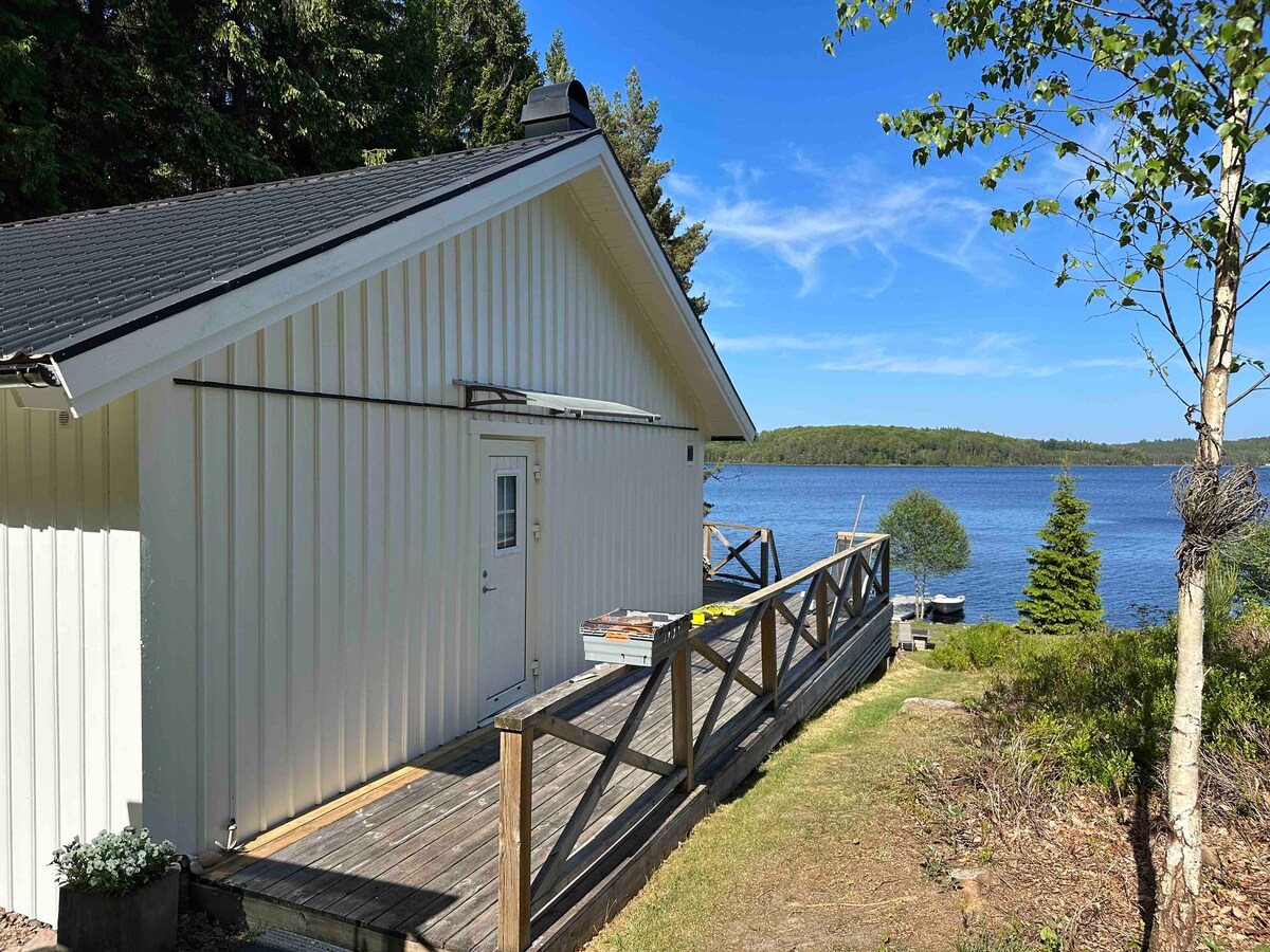 Kom till detta unika och lugna boende. Bo i denna nybyggda attefall på 40kvm plus sovloft. En bäddsoffa för 2 personer eller så kan man bo på loftet, med utsikt över sjön Duscha gör du utomhus med varmt o kallt vatten med utsikt över sjön. Sjön ligger strax nedanför huset med tillgång till tomtens egen brygga, där du kan låna båt eller kanot. Cyklar finns att låna. Närmsta affär är i Ätran, ca 8 km. Städning kan köpas till för 700kr. Sänglinne o handdukar finns att hyra, 150kr per set.