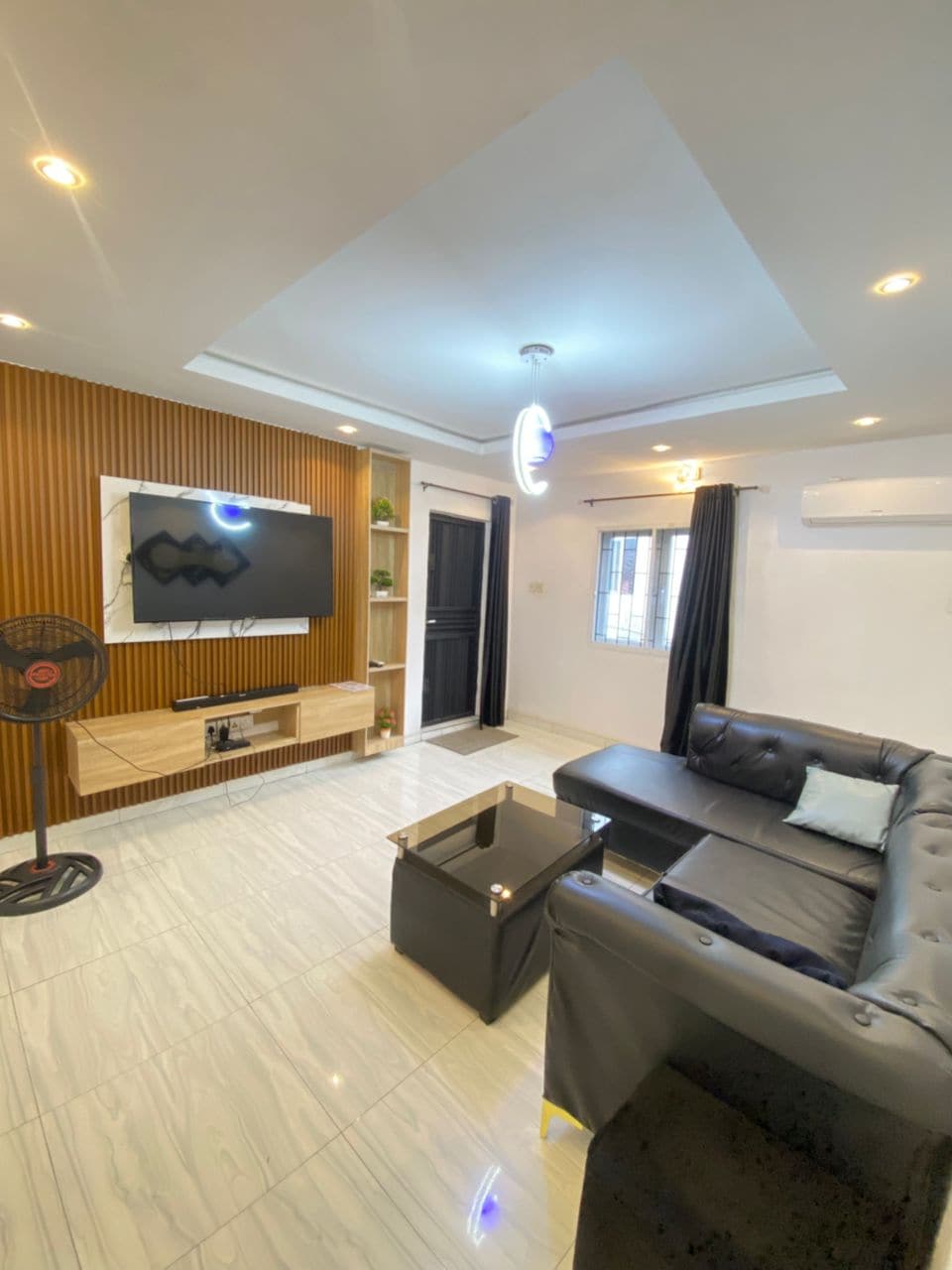 Harga untuk penginapan jangka panjang, Wifi internet gentian, tiga (3) Penyaman udara, air panas, sistem Inverter Suria, selamat, katil besar, halaman belakang persendirian, tempat letak kereta persendirian, dapur yang luas, taman permainan kanak-kanak, TV pintar, pokok/kayu neaby untuk mengumpul udara segar dan banyak lagi. Bersantai dengan seluruh keluarga di tempat yang damai ini. Ruang kerja/meja yang sesuai. NGN 10,000 unit elektrik yang disediakan semasa daftar masuk, selepas itu tetamu akan bertanggungjawab untuk kos elektrik.