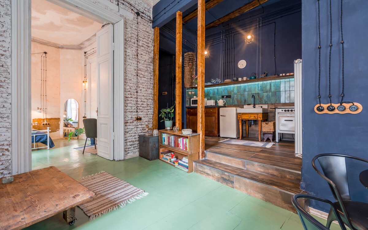 Studio PERINDUSTRIAN di bangunan lama Soviet yang direka oleh "VIRSTAK", membawa suasana unik dengan PEMANDANGAN BANDAR siang dan malam yang menakjubkan yang boleh dinikmati dari TAB MANDI. -100% BUATAN TANGAN. - Bukan apartmen selesa/berfungsi SECARA RAWAK, kemudahan Studio terdiri daripada perabot vintaj dan perindustrian lama, bagi sesetengah orang mungkin berasa tidak selesa kerana citarasa peribadi. Suasana artistik yang membuat anda rasa seperti dalam filem. - KILANG WAIN - 9 JENIS wain - Projektor Filem Pengambilan di lapangan terbang Suzuki Swift 80 Gel