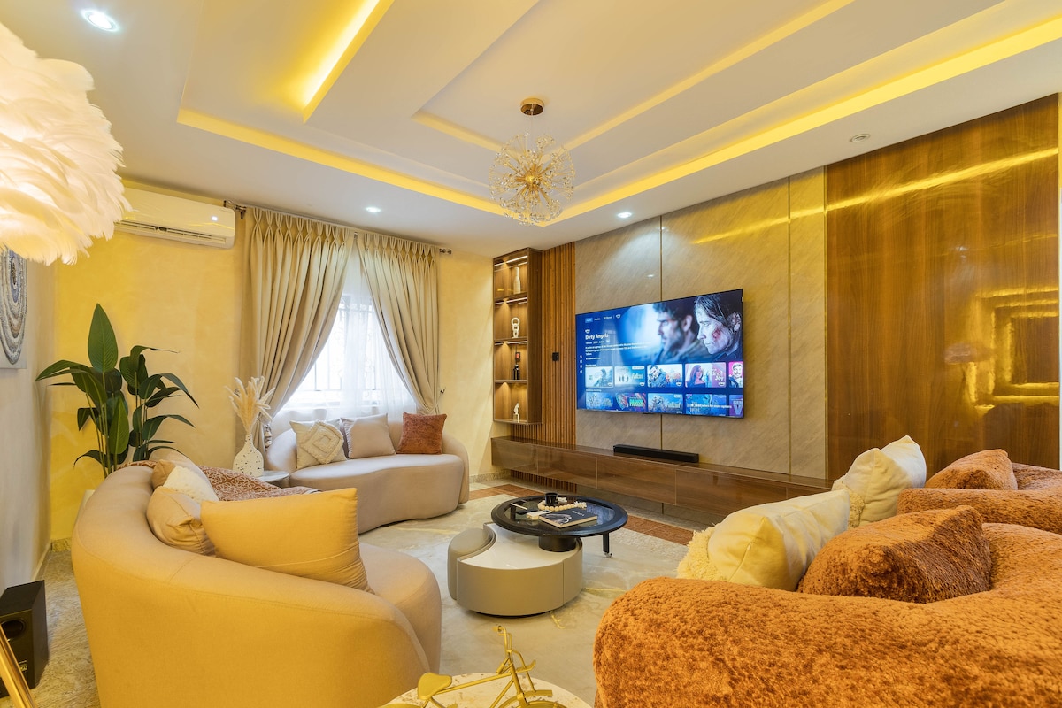 * Terletak di tengah-tengah estet berpagar. * Elektrik 24 jam * Internet gentian optik * Ruang tamu berperabot kontemporari dengan sofa kulit * Mesin basuh * TV Pintar Skrin Besar, Netflix, DSTV, pemain CD/DVD * 4 bilik tidur 4 bilik mandi en-suite dengan Smart TV dalam bilik * Sepenuhnya berhawa dingin * Dapur serba lengkap * Bilik mandi berjubin dengan water heater & shower bertekanan * 3 minit dari pusat membeli-belah/Shop-rite Ikeja City * 10 minit dari lapangan terbang tempatan & 15 minit dari lapangan terbang antarabangsa * Pembersihan rumah