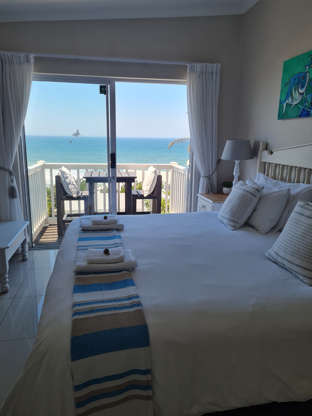 This self-catering luxury suite has a king bed that can accommodate a couple. It has an amazing sea view, an en-suite full bathroom with a bath and shower, and a well-equipped kitchenette. The unit has a smart TV, DSTV, Wi-Fi and Netflix. The unit opens to a patio with outdoor table and chairs. We are equipped with a back-up generator and water supply for any outages plus all water on the property is filtered and UV treated.
