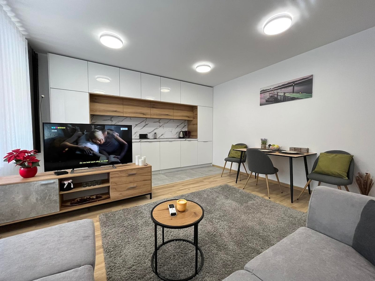Selamat datang ke apartmen gaya Nordic kami yang cerah, di mana reka bentuk bersih dan keselesaan bertemu. Ruang tamu yang luas, dapur lengkap dan cahaya semula jadi mewujudkan ruang yang tenang dan menarik. Terletak dalam jarak yang mudah dari pusat bandar, anda akan menemui kafe, restoran dan kedai berhampiran. Bagi pencinta alam semula jadi, West Park yang indah hanya beberapa minit perjalanan dari sini, menawarkan pemandangan hijau dan tempat percutian yang tenang. Sesuai untuk kerja atau percutian, apartmen ini menggabungkan gaya, keselesaan dan kemudahan untuk penginapan anda.