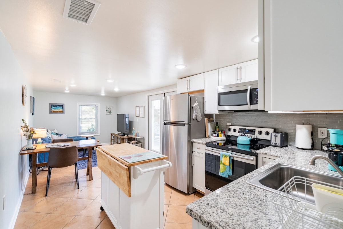 Percutian Moden Peribadi Anda 🏆 Alami privasi sepenuhnya di suite yang bergaya dan diperbaharui ini yang menampilkan pintu masuk persendirian khusus. Ruang ini direka untuk berehat dan meningkatkan produktiviti dengan lantai laminat moden, katil Queen mewah dan TV besar. Untuk kemudahan anda, bilik ini menyediakan ketuhar gelombang mikro dan peti sejuk/peti sejuk beku kecil. Dapatkan tidur yang paling selesa dengan langsir gelap dan bidai untuk kawalan cahaya sepenuhnya. Dilengkapi dengan bilik mandi peribadi dan pancuran mandi—pangkalan yang sempurna dan selamat untuk penginapan anda!