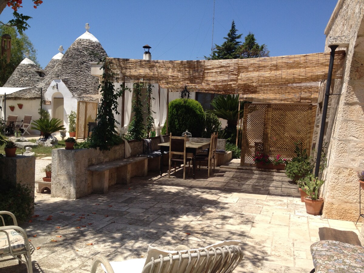 Trulli dan Alam Semula Jadi berdiri di kampung yang menyenangkan di atas bukit (245 m di atas paras laut) bandar Monopoli. Rumah desa tipikal Puglia selatan ini, adalah tempat yang ideal untuk menghabiskan percutian anda dengan tenang, di bawah bayang-bayang pokok oak raksasa dan pokok zaitun, dikelilingi oleh taman yang terawat dengan bunga dan pokok buah-buahan yang harum ( ceri, pic, epal, dll.). Trulli boleh memuatkan sehingga 4 orang (2 di bilik tidur dan 2 di ruang tamu di atas katil sofa yang selesa.