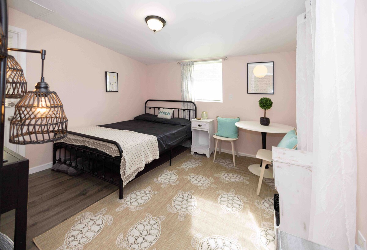 Bersantai di rumah tetamu 1 bilik tidur/1 bilik mandi yang bersih, menawan dan kontemporari ini. Suite ini mempunyai pintu masuk persendirian, patio dan tempat letak kereta. Kemudahan moden baharu yang disediakan dengan ketuhar gelombang mikro, dapur memasak, pembuat kopi, TV 2 50”dengan Roku dan banyak lagi. Bilik tidur yang luas mempunyai katil bersaiz king elektronik yang sesuai untuk berehat dengan bilik mandi penuh dan almari pakaian.