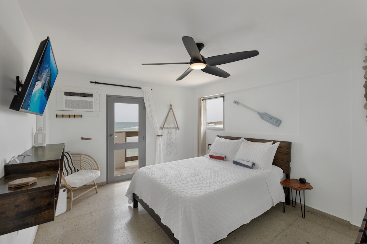 Nikmati keseluruhan pemandangan laut Apt w 2 bdrms w a/c, katil queen di setiap bilik tidur. LR dilengkapi dengan a/c, internet/Wi-Fi percuma, tv pintar 50". *Penginapan untuk sehingga 4 orang di premis. Meja makan dengan tempat duduk untuk 4 orang, Kaunter w 2 tempat duduk Dapur mempunyai peralatan. Balkoni & teres persendirian dengan pemandangan pantai & laut yang menakjubkan. Berjalan kaki sebentar ke pantai & Pusat Bandar Isabela. Lapangan Terbang BQN 10 minit. Kami membenarkan seekor anjing dilatih untuk tidak melebihi lebih daripada 35 paun. "Seluruh apt berkuasa solar".