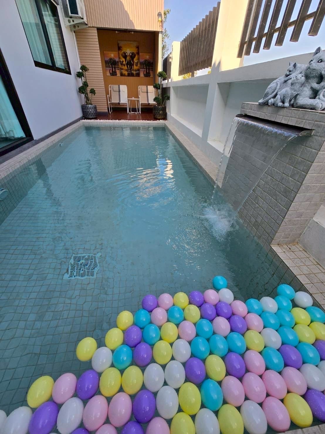 Bonita Pool Villa, 4 rumah mandi, 4 bilik mandi, dengan kolam renang peribadi dan semua kemudahan dalam rumah, selesa, suasana yang baik, tidak berhampiran dengan Elephant Arena dan Buriram Racecourse, Litar Antarabangsa. Terdapat perkhidmatan pembantu rumah untuk membersihkan, menukar tuala, mengisi semula air minuman, ais percuma setiap hari penginapan anda.