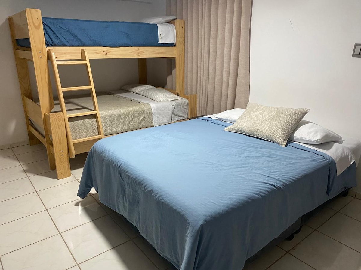 Bersantai bersama seluruh keluarga di tempat penginapan yang tenang ini. Nikmati penginapan anda di apartmen yang selesa, dengan bilik double dan double, 2 bilik mandi dengan air panas, ruang tamu - dapur dan garaj. Kami juga mempunyai bilik double dan double semua dengan bilik mandi dalam. Kawasan selamat dan tiga min ke pantai. Nikmati dengan keselamatan dan jaminan . Bergerak menanti