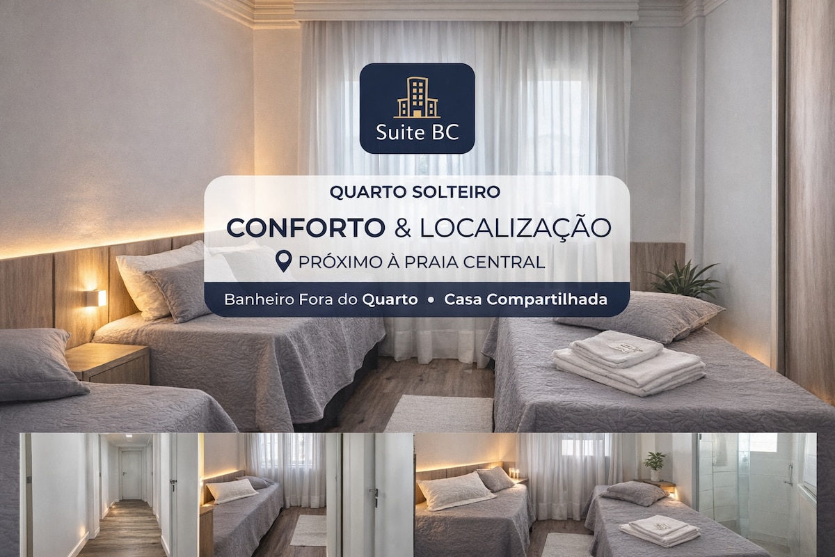 Suíte Privativa para até duas pessoas, em apartamento compartilhado. Dispomos de jogo de cama completo padrão hotel, toalhas de banho, rosto e piso, ar-condicionado, wifi e uma vaga de garagem (sob consulta de disponibilidade). Localização privilegiada em BC, quadra mar, apenas 2 minutos da praia. Supermercado, farmácias e diversas lojas e conveniências em frente ao residencial.