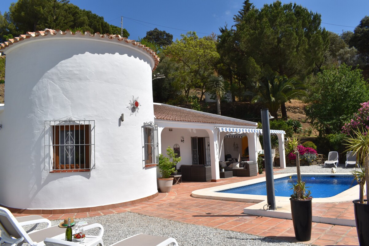 Rumah luar bandar yang tenang di pergunungan dengan pemandangan laut terbuka. Teres yang cerah, senyap, dan dikelilingi alam semula jadi. Sesuai untuk penginapan musim sejuk: suhu sederhana, banyak cahaya, dan matahari terbenam yang indah di atas Mediterranean. Sesuai untuk pasangan yang ingin berehat, berjalan kaki dan menikmati Andalusia jauh daripada orang ramai. Pada musim bunga dan musim panas, rumah ini menjadi tempat percutian persendirian dengan kolam renang persendirian yang besar, privasi lengkap dan pendingin hawa untuk keselesaan maksimum. Akses mudah dari Lapangan Terbang Málaga, namun benar-benar tenang.