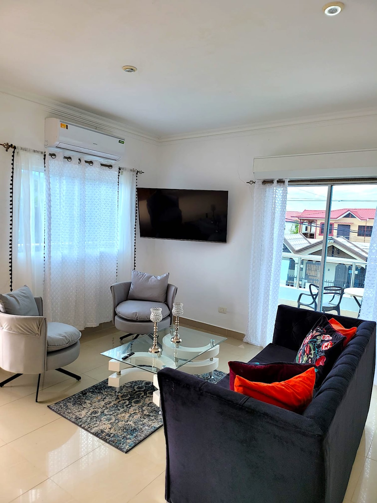 Enjoy the whole family in this spacious and peaceful accommodation with a modern and luxurious style, located facing the Jarabacoa Mountains and just 5 minutes from the town center. The apartment features child safety locks on windows and balconies, 2 bathrooms, 2 bedrooms with elegant floating beds, air conditioning in the bedrooms, a BBQ area, a heated jacuzzi, a fully equipped kitchen, a laundry area, a panoramic balcony, and private parking on the premises.