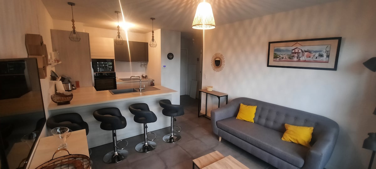 T3 seluas 55 m2 di satu tingkat dengan teres seluas 30 m2 dan taman yang menghadap pemandangan yang indah. 20 km dari pantai Anglet dan Biarritz, 15 km dari gunung dan sempadan Sepanyol. hanya 15 minit dari bilik mandi terma Cambo. 5 minit dari Espelette 10 minit dari Lake St Pée sur Nivelle. termasuk: - 2 bilik tidur dengan katil double 140*190 - 1 dapur lengkap (ketuhar, ketuhar gelombang mikro, peti sejuk, pinggan dan tudung) 1 bilik air dengan pancuran mandian walk-in 1 tandas - 1 ruang makan (tingkap teluk menghadap teres dan taman) - Tempat letak kenderaan persendirian - TV - Akses Wifi - Mesin basuh pinggan mangkuk - Bilik dobi - Bekalan linen - Katil matahari - Plantxa Apartmen ini masih baru! Haiwan peliharaan tidak dibenarkan dan apartmen tidak merokok. Kediaman Utama