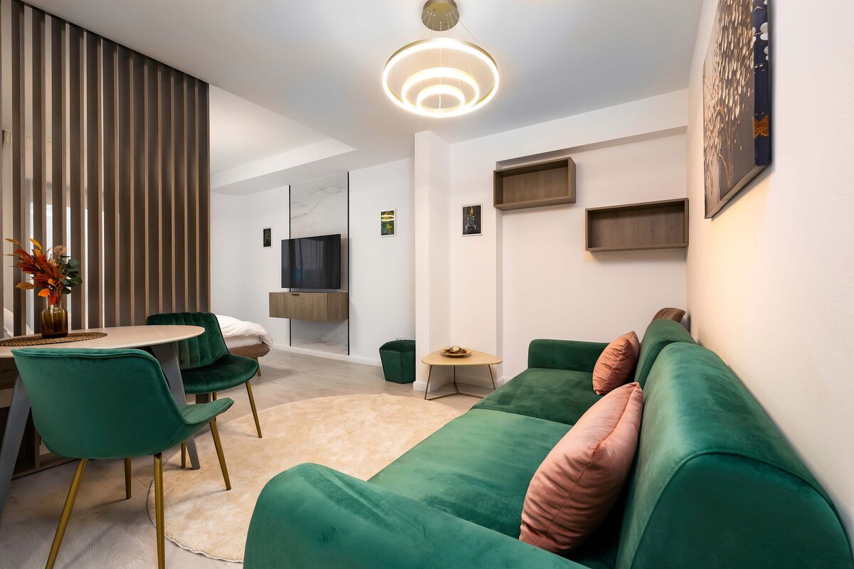 New and modern apartment - feel at home in a quiet area, just 5 minutes walk from the metro station. The old city center of Bucharest is only 15 minutes away, so you can enjoy the charm of the city. Relax in the private garden and enjoy a delicious coffee, admiring the green grass. The apartment has WiFi6, dishwasher, washing machine with dryer, coffee maker, air conditioning, TV and a very comfortable sofa bed for a restful sleep.