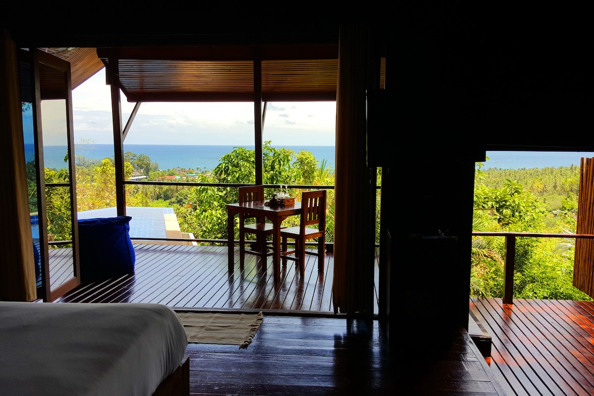 Tiada YURAN PEMBERSIHAN! Vila moden, namun tradisional anda, terletak di atas kampung Chalok Baan Kao dengan pemandangan yang paling menakjubkan di atas tumbuh-tumbuhan dan 180° di atas laut. Kami memberi tumpuan kepada privasi dan pemandangan laut dari setiap sudut rumah. Horizon menampilkan 1 bilik tidur, ruang tamu yang luas, dapur Barat yang lengkap, bilik mandi besar dengan batu semula jadi yang dibina di dalamnya, almari pakaian dan bahagian terbaiknya adalah di luar - teres dengan kolam renang infiniti, meja makan dan sala sejuk.