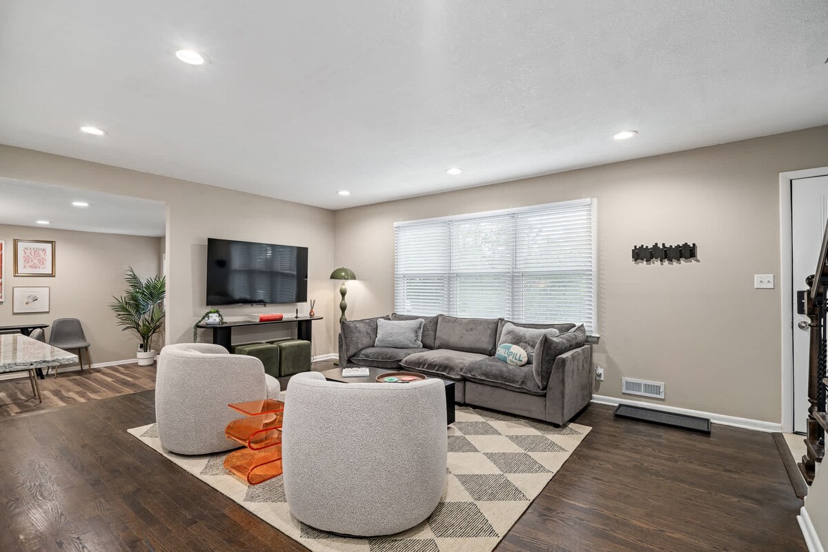 Bersantai di kejiranan #1 yang paling banyak dicari di Zillow pada tahun 2022! Rumah Prairie Village kami mempunyai Wifi 5GB yang PANTAS, 4 bilik tidur dengan tilam terbaik, peralatan tempat tidur duvet yang selesa, mesin bunyi, & banyak ruang almari. Bilik teater kami boleh berfungsi sebagai BR ke-5 & sofa tidur di ruang bawah tanah sebagai BR ke-6! Nikmati tab mandi air panas persendirian, pawagam, dapur solo di belakang rumah, gimnasium & banyak lagi. 🏟️ 22 minit dari Chiefs/Royals 🏙️ 18 minit dari suasana Downtown yang meriah ☕️ Beberapa minit dari restoran kegemaran tempatan & kedai PV!