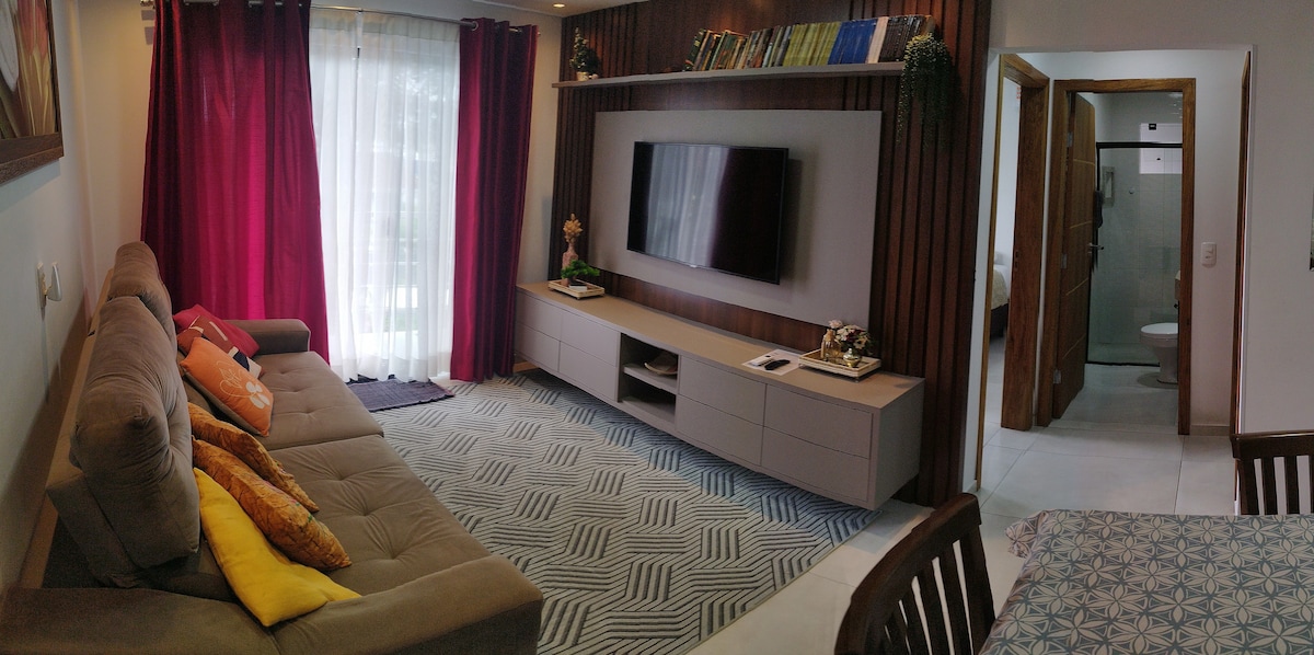 O apartamento é no segundo andar (então é necessário subir as escadas) e conta com a área aconchegante da sacada para você e sua família. Possui quarto de casal com cama box Queen, banheiro com chuveiro pressurizado, sala e cozinha conjugada com TV 50”, todos os utensílios, eletros premium, fogão com forno, geladeira, microondas, máquina de lavar, varal, tanque e ferro de passar. Além disso, fornecemos todo o enxoval necessário para a sua estadia! Vamos surpreender você positivamente!
