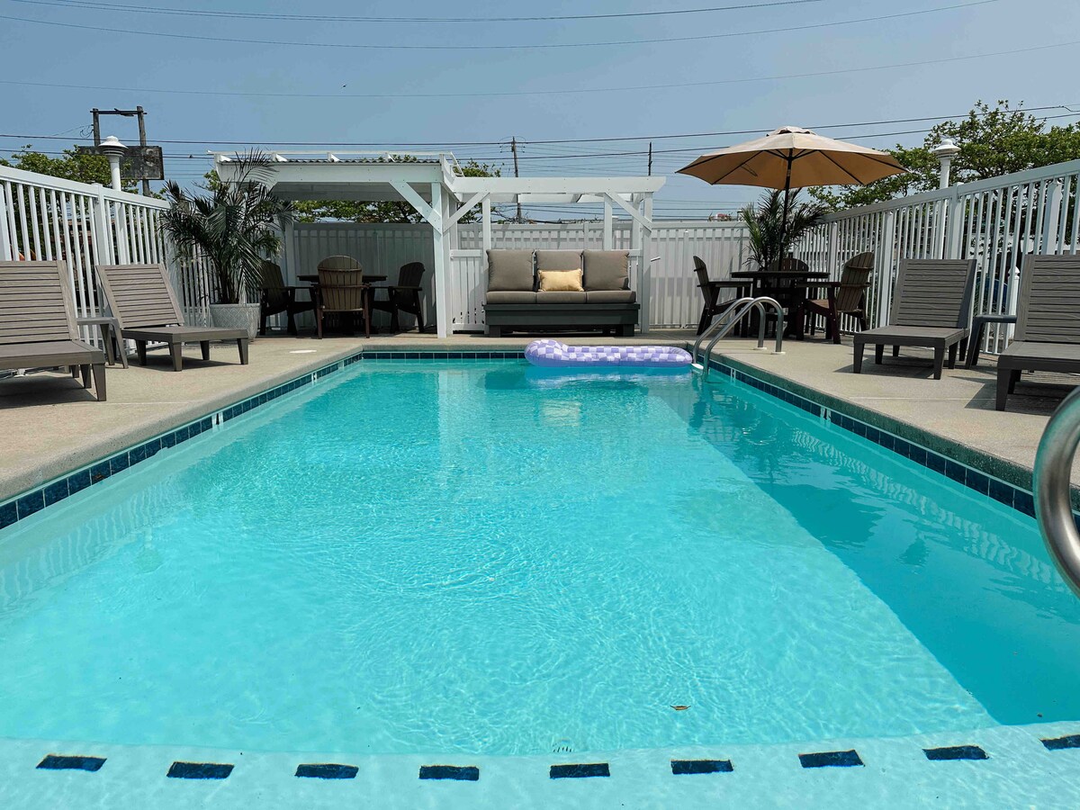 Nikmati percutian keluarga anda yang seterusnya ke Ocean City di 2 bilik tidur dan 2 bilik mandi penuh yang diubahsuai kondominium ini. Berhampiran dengan semua yang anda ingin lakukan, kami berada di tepi teluk, 4 blok dari laluan pejalan kaki dan pantai, beberapa minit dari taman hiburan dan restoran Jolly Rogers. Kondominium ini menawarkan dapur penuh dengan mesin basuh pinggan mangkuk, mesin basuh/pengering persendirian, AC, TV pintar dan WIFI. Mesti berumur 25 tahun untuk menempah. Tinggal bersama kami!