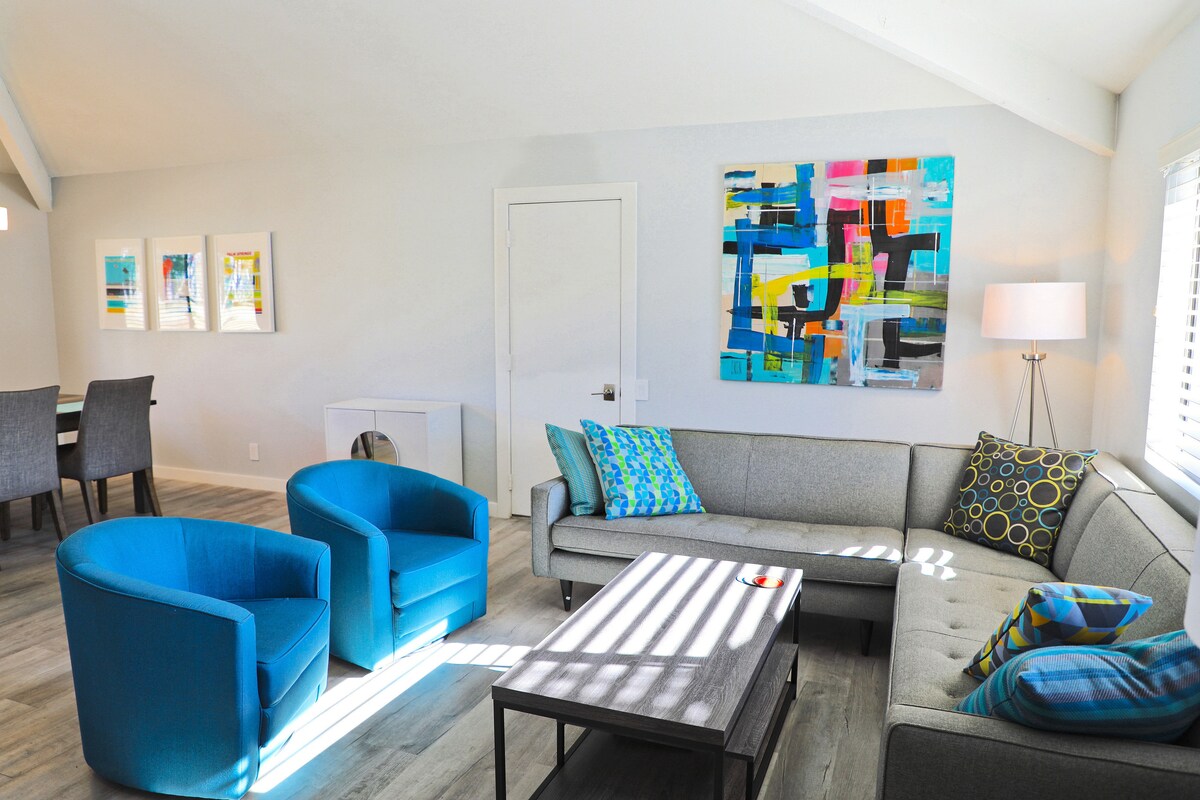 Rumah gaya pertengahan abad kami telah dimodenkan dengan bergaya sambil masih mengekalkan pesona zamannya. Ia mempunyai 4BR/3BA (1 suite utama di bahagian utama, 1 di casita berasingan). Halaman belakang mempunyai suasana resort peribadi retro dengan mural dinding yang dicat tangan, kolam air masin dan spa, lubang api gas, BBQ, pelampung kolam renang, kanopi patio tertutup dengan banyak tempat untuk berehat, dan pokok limau gedang berusia 50+ tahun. Kami ingin menjadi hos anda dengan Wi-Fi yang sangat kuat, pemandangan gunung dan udara gurun yang segar. ID Bandar Palm Springs #3033