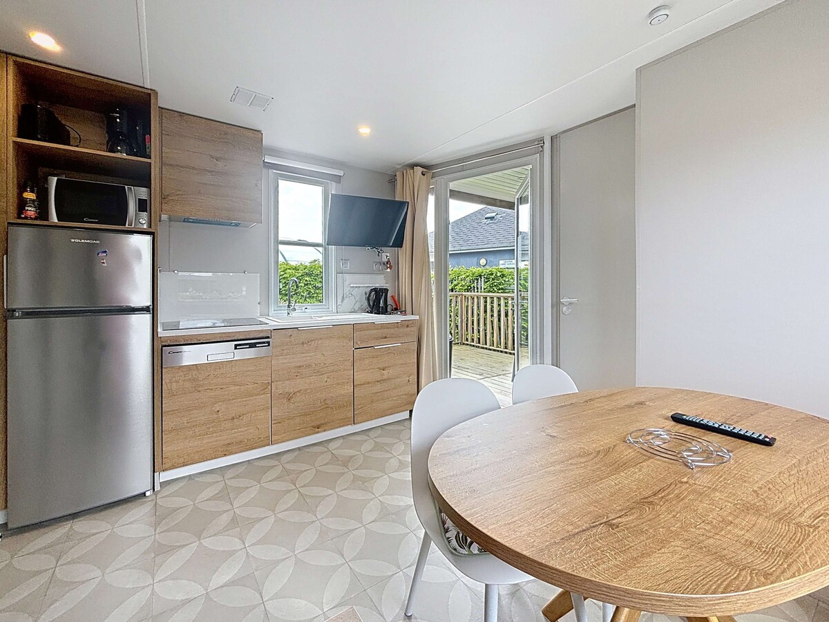 Tempat yang tenang ini menawarkan penginapan santai yang dijamin! Terletak di dalam tapak perkhemahan 3*, anda boleh menikmati laut 50m jauhnya atau kolam renang yang tertutup dan dipanaskan untuk hujung minggu atau seminggu dengan keluarga atau rakan...