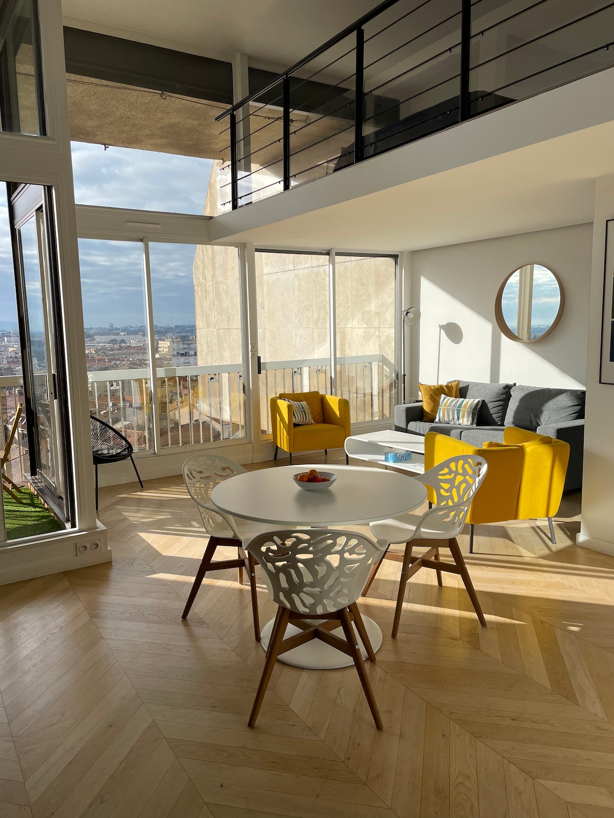 Loteng gaya besar di pusat Montpellier, di antara Place de la Comédie dan pusat membeli-belah Polygone, dengan pemandangan bandar yang menakjubkan dan sehingga Laut Mediterranean, tingkat 11 dengan lif.