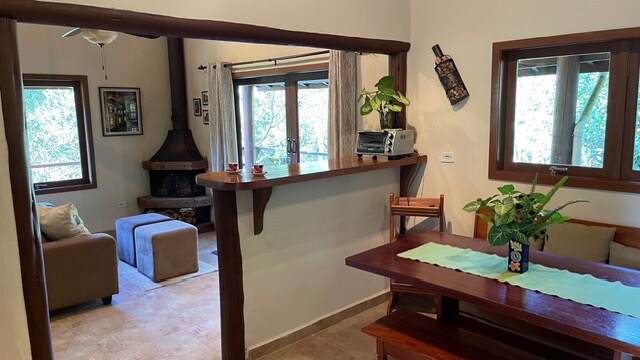 Das 3 suites, 2 são para fora da casa, com janelas enormes, cama king e ar condicionado quente e frio. 1 suite dentro da casa, como cama queen e super aconchegante. Piscina, sauna, parrilla, lareira, forno a lenha, tv a cabo etc tudo o que você precisa para descansar e dar uma recarregada nas baterias. A casa costuma ter excelente avaliação de limpeza. Caseira pode prestar serviço durante e estadia: limpeza de louça/ cozinha como preparo de refeições.
