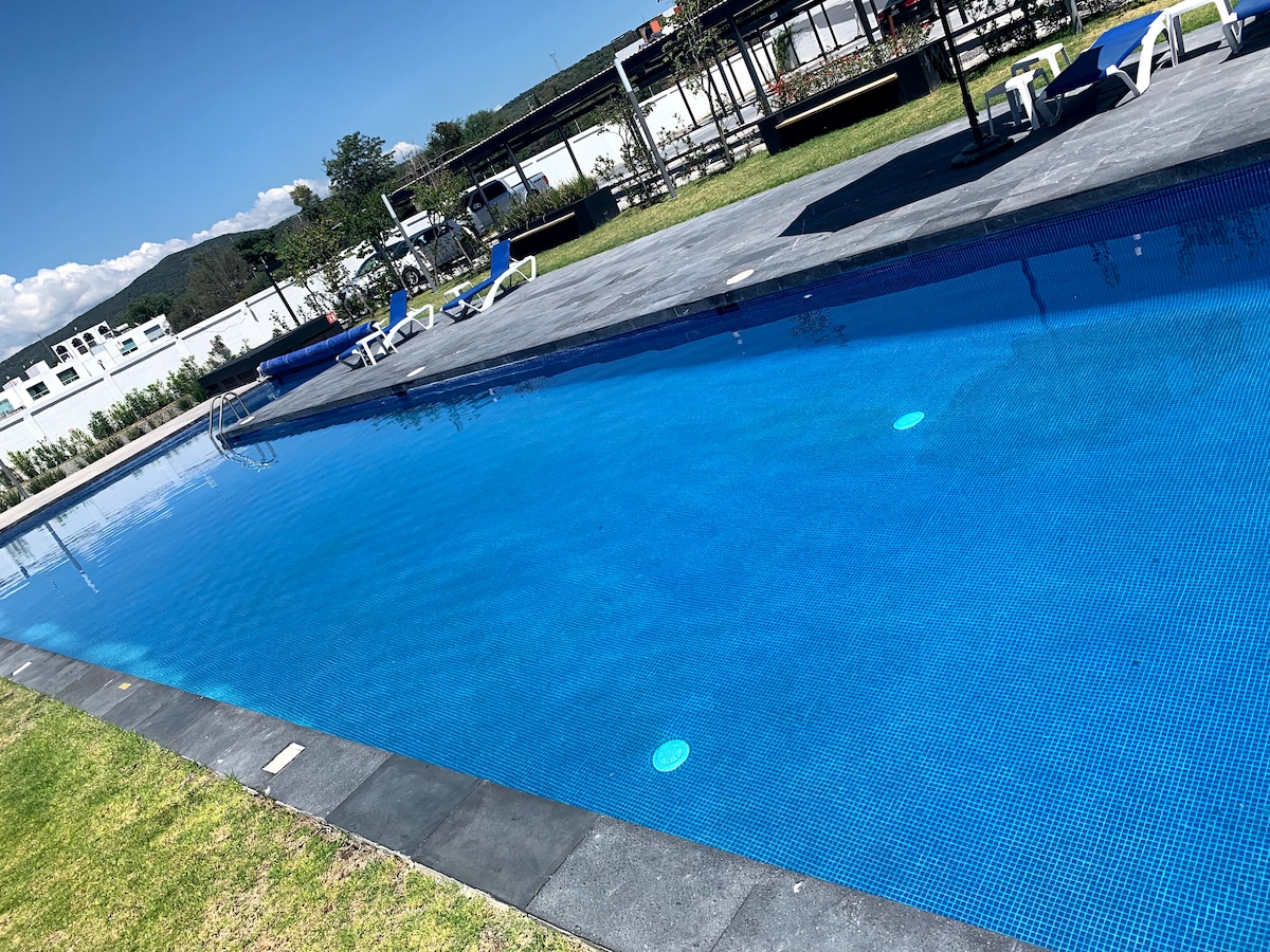 Di salah satu tempat yang paling cantik dan selamat di Querétaro, ia mempunyai kolam renang dan Jakuzi. Berdekatan dengan pusat membeli-belah, UVM, taman industri, sekolah, padang golf. dan semua kemudahan Rumah di kondominium dengan 2 bilik yang selesa, sangat terang *Ruang tamu *Ruangan makan *Dapur yang lengkap *Desktop untuk kerja * mesin basuh *mesin pengering *Patio *Tempat letak kereta untuk 2 buah kereta * Grid Elektrik * Akses Persendirian dengan Lembaran Elektronik *WiFi *kolam renang * tab mandi air panas *taman dengan permainan untuk kanak-kanak