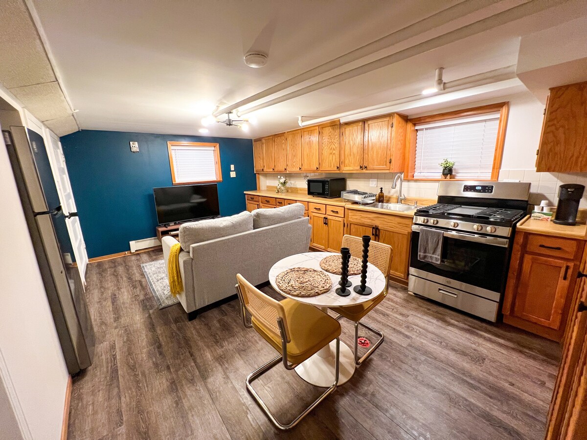 Kemasukan percuma ke Muzium Betty White Terkecil di Dunia! Oh, dan katil bersaiz king yang selesa di apartmen studio yang baru dikemas kini. Terletak di tengah-tengah Oak Park, berhampiran dengan kafe dan transit. Kejiranan yang tenang dan mesra dengan tempat letak kereta tepi jalan yang luas dan pub di seberang jalan. Ini adalah unit bawah tanah dengan dapur kecil (tiada DAPUR/KETUHAR), bilik TV yang selesa, sudut meja, dan bilik mandi penuh. Katil ini bersaiz king dan mempunyai tilam yang kukuh. Lereng lantai dan tiada termostat, tetapi ia comel + mengalu-alukan