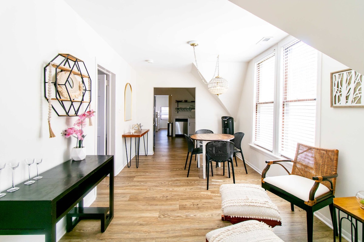 Tempat unik ini mempunyai gaya tersendiri. Nikmati studio tetamu yang cantik dan selesa ini dengan sentuhan moden dan ruang tamu berperabot lengkap, dapur kecil dengan peti sejuk mini dan ketuhar gelombang mikro untuk memanaskan semula makanan ringan sebelum menuju ke bandar, bilik mandi penuh dengan pancuran hujan dan penyembur pegang tangan untuk membantu anda berehat selepas hari yang panjang. TV skrin rata dengan peranti penstriman Xfinity supaya anda boleh menyambungkan akaun anda dan menikmati rancangan dan filem kegemaran anda untuk penginapan yang senyap.