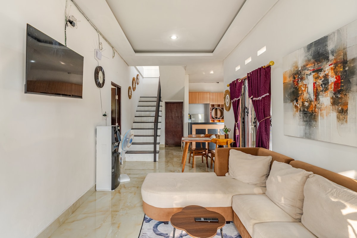 Vila 3 bilik tidur persendirian. Moden, berseni & direka untuk menempatkan 6-7 orang dewasa dengan selesa — sesuai untuk keluarga atau pengembara kumpulan dengan jantina yang sama. Bersantai di ruang tamu yang selesa dengan suasana seni retro, lengkap dengan TV Pintar dengan Netflix & pembesar suara Harman Kardon. Terdapat juga bilik solek di tingkat satu. Nikmati makanan di ruang makan dengan sudut kopi comel yang menampilkan mesin espresso De Longhi. Dapur moden dilengkapi dengan pulau estetik, dapur berdiri dengan ketuhar dan peti sejuk.