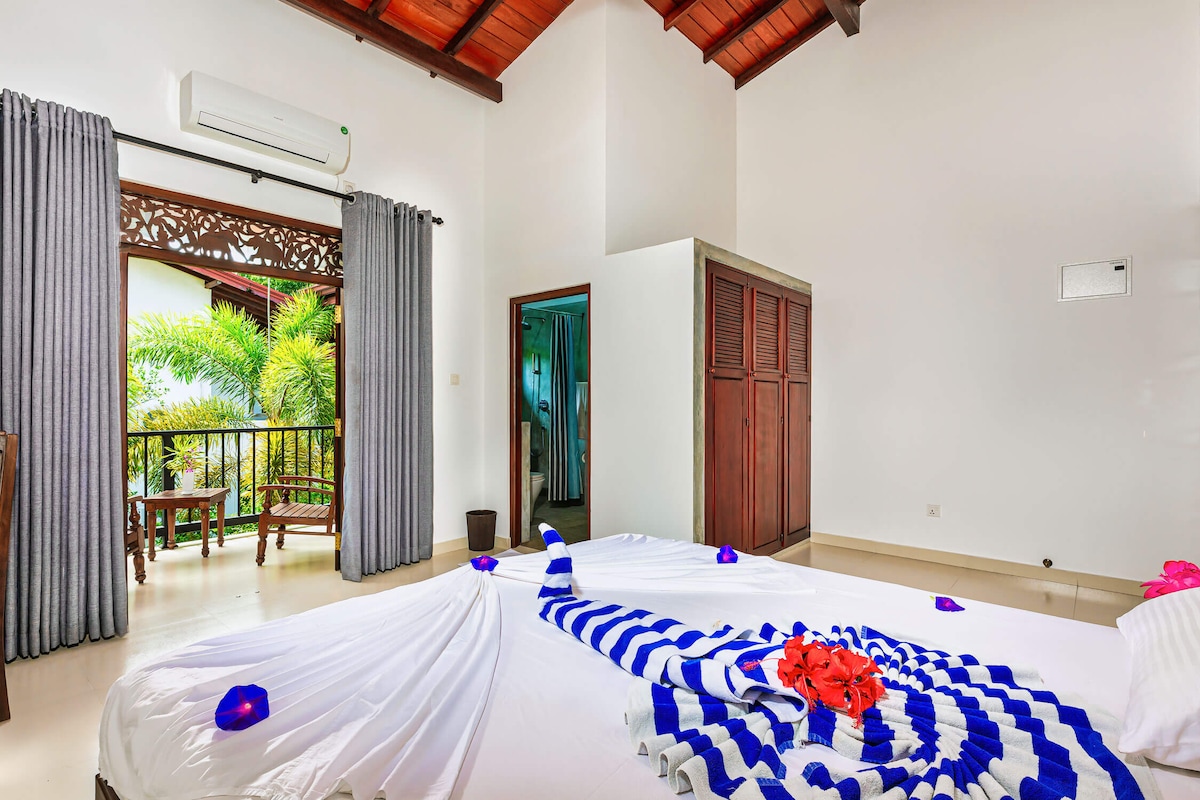 #Double Room 04 Enjoy a relaxing stay at Roy Villa Landside Hotel, Beruwala. Our spacious 2-person family room features air-conditioning, a private bathroom, kitchenette, and garden or pool views. It includes a king-size bed. Just 100 m walking distance to the private beach, guests can also enjoy the spa, outdoor pool, and free bicycles. The restaurant offers local, Asian, and international dishes with vegetarian and halal options for a perfect coastal getaway.