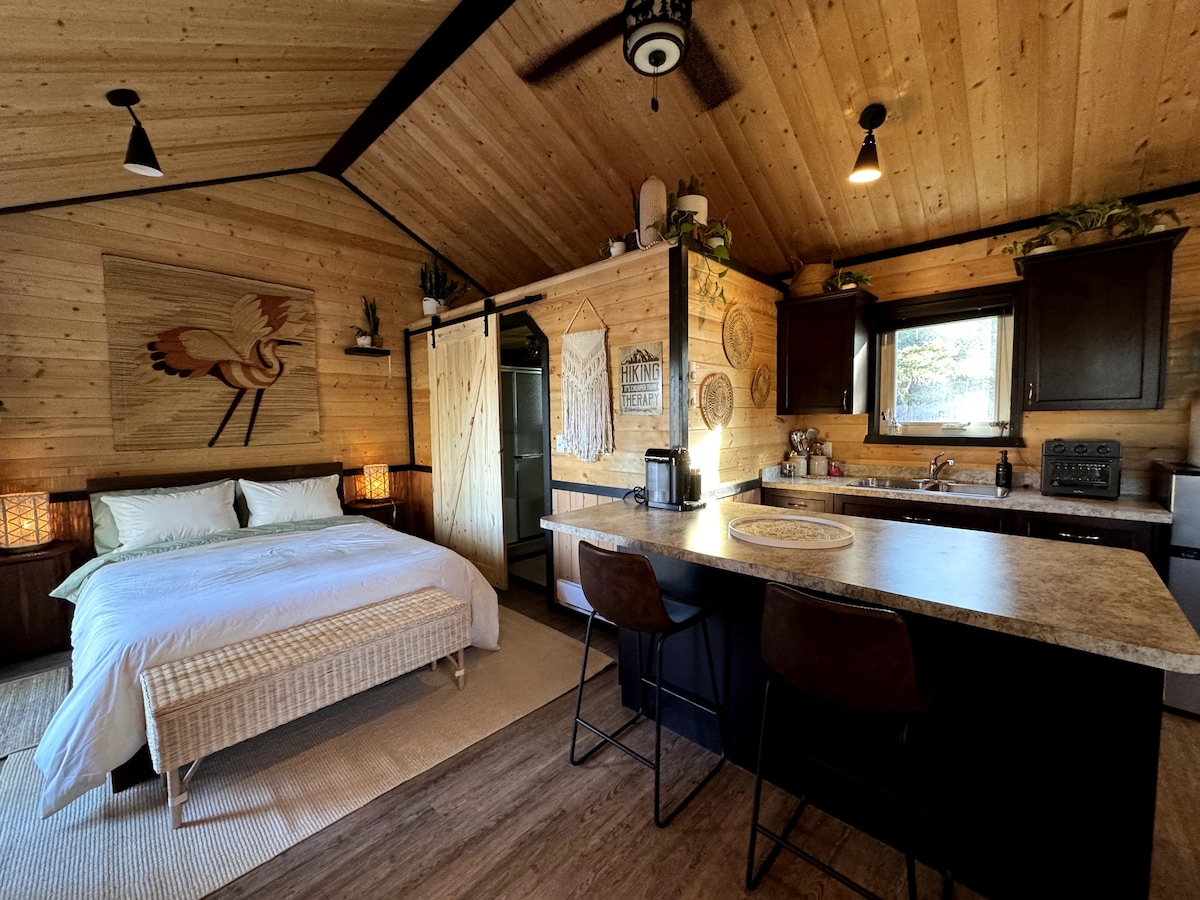 Bersantai di tempat percutian 300 kaki persegi yang bergaya ini, di mana ketenangan bertemu dengan pesona desa. Terletak di sepanjang jalan desa yang damai, kabin kami menawarkan percutian yang sempurna-sama ada anda bersiar-siar ke anak sungai berhampiran, meneroka alam semula jadi, atau sekadar menikmati ketenangan. Di dalamnya, anda akan menemui ruang yang direka dengan teliti yang menampilkan dapur dan ruang makan, ruang tamu yang selesa dan bilik tidur dengan katil queen yang empuk. Dapur kayu memastikan kabin hangat dan menarik, dengan kayu api disediakan untuk kemudahan anda.