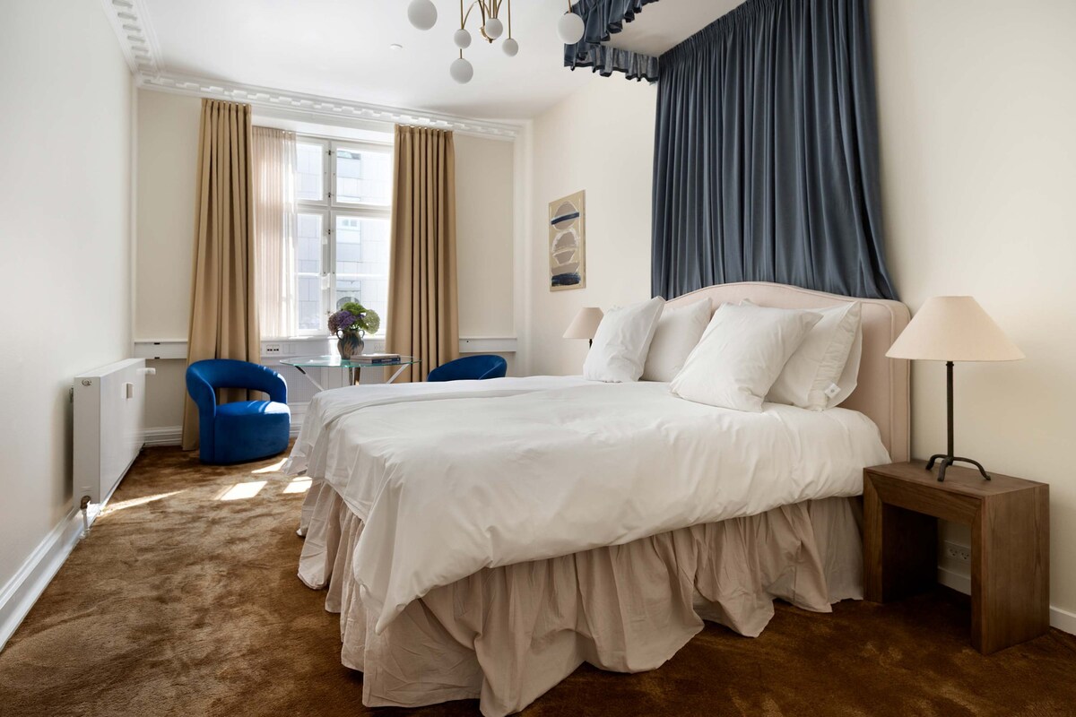 Grand Heritage by the Royal Residence Set in a stately building beside Churchill Park and just steps from Amalienborg Palace, Churchill Manor is a rare 170 m² apartment that blends historical elegance with playful modern eclecticism. The interiors burst with bright colors, bold details, and a confident mix of old and new—bringing vibrant energy into a grand, manor-like setting. Occupying the entire first floor, the apartment features 3 stylish bedrooms and 1.5 bathrooms.