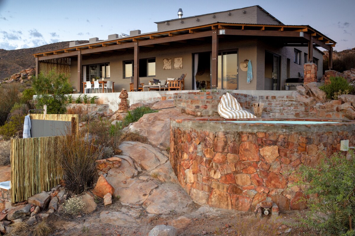 Bersantai di ruang yang tenang dan bergaya ini yang terletak di kaki gunung di barat dayaTankwa Karoo. Selamat Datang ke Groot Kloof Farm, 1 200 hektar hutan belantara semula jadi yang tidak tercemar untuk diri anda sendiri, hanya 2.5 jam memandu dari Cape Town. Windmill Cottage terletak 6km ke barat dari pintu gerbang Groot Kloof Farm di R355, memastikan privasi dan kesendirian mutlak. Harap maklum bahawa pin lokasi AirBnB menunjukkan lokasi pintu pagar dan bukannya lokasi kotej.