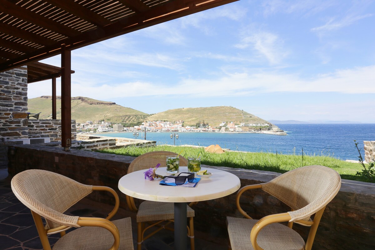 Located in one of Kea's most prestigious areas , Vourkari ,our suite blends understated luxury with authentic Cycladic simplicity. Just 50 meters from the island 's best restaurants, bars, and shops and only a few steps from the beach. Guests have access to the outdoor pool, which seems to merge seamlessly with the sea. Enjoy breathtaking views of the beach. The perfect spot to savor your glass of wine at sunset. With only four suites in total , the hotel ensures privacy and tranquility.