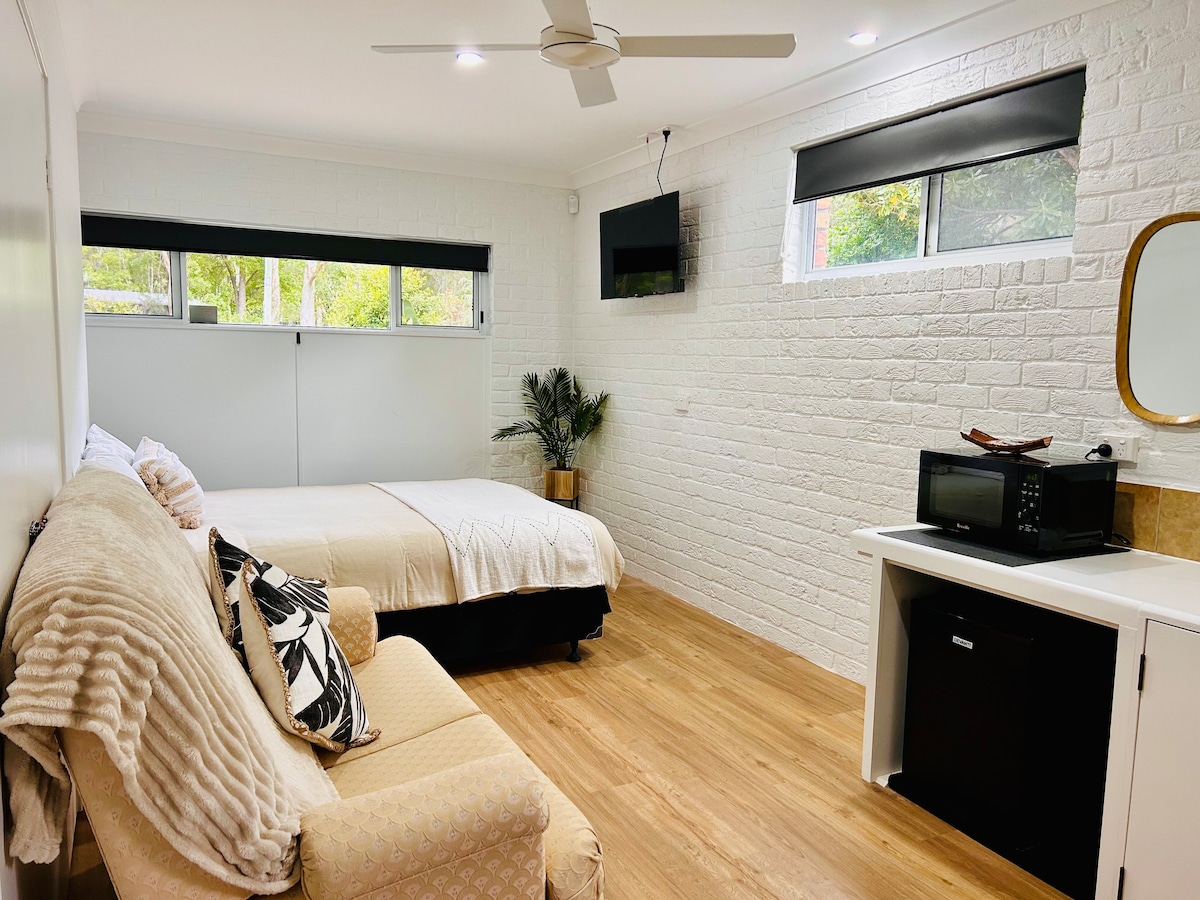 Mengembara ke pantai utara Ngambaa Country yang indah? Studio gaya Indonesia ringkas di garaj yang diubah suai. Terletak di jalan yang tenang. Sesuai untuk overnighter atau meneroka kawasan ini. Kemudahan akses mudah tiada anak tangga pintu masuk berasingan ke rumah. 12km ke Scotts Head, 4km ke Grassy Head, 15 minit berjalan kaki ke pantai tempatan, 6 minit berjalan kaki ke kedai. Katil Kelamin, Kipas siling, Bilik mandi dan dapur baharu. Terletak di sebelah belukar menjangkakan untuk melihat goannas, pepijat dan jika anda bernasib baik satu atau dua cicak. Anda juga boleh menyapa chooks kami.