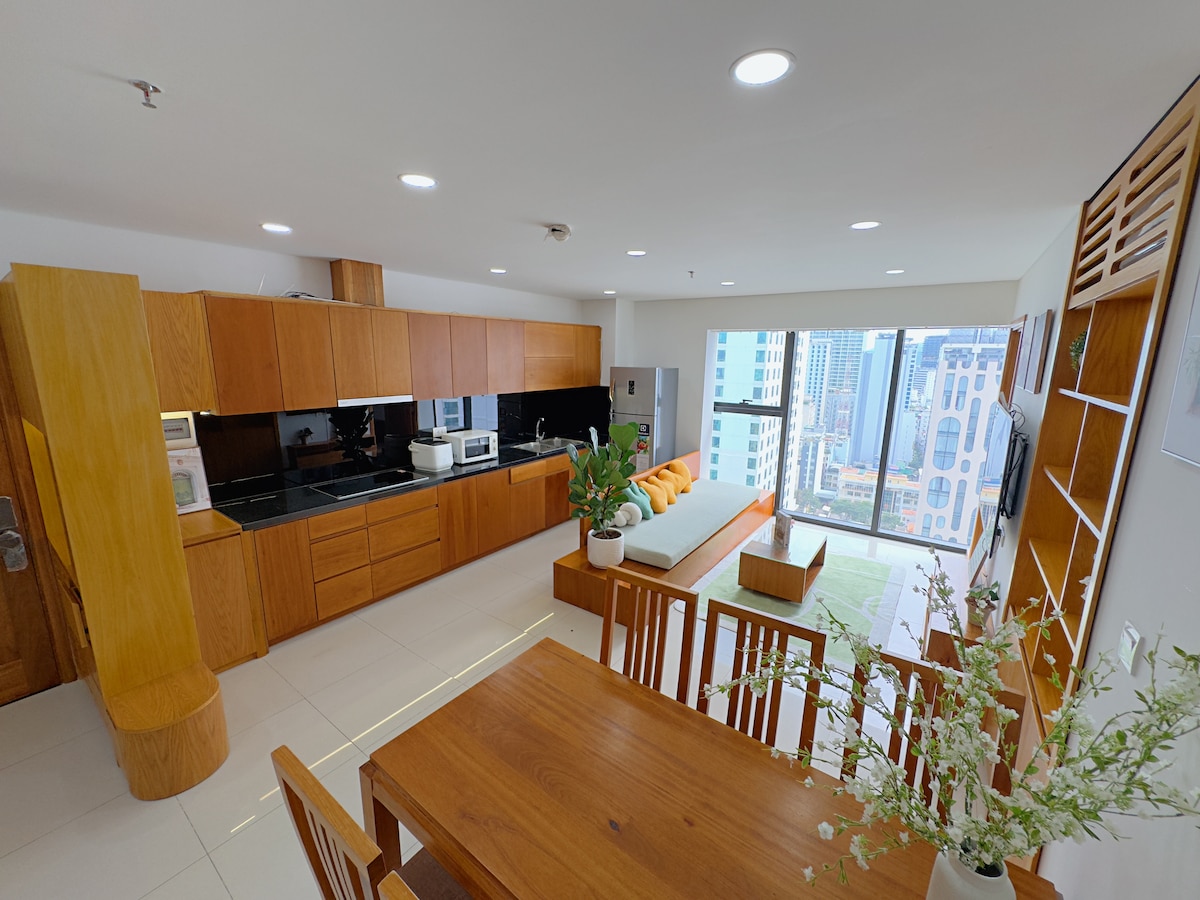 Selamat datang ke Sunnyhomes kami ! Dengan lokasi yang sempurna: 2 minit berjalan kaki ke Jalan dan Pantai Tran Phu. 5 minit berjalan kaki ke Menara Tram Hương (Menara Agarwood) dan Pasar Malam! 2 minit berjalan kaki ke Vincome Center (Pasar), Lotte Center, Xóm Mới Market..! Rumah kami terletak di Bangunan Tuiblue/Hotel 5 bintang) dengan Apartmen Studio yang selesa, selesa dan Besar (dimensi lebih 55m2)!Penginapan ini sesuai untuk pasangan, pengembara solo, pengembara perniagaan, kumpulan orang dan keluarga!!
