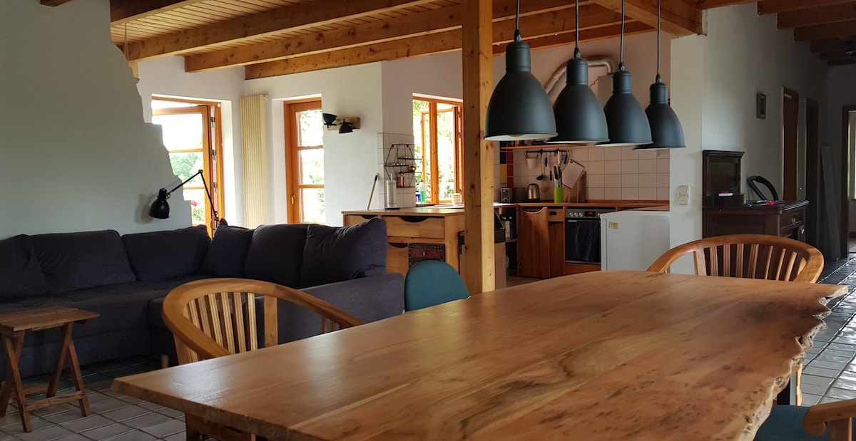 "Kapel" kecil kami terletak di bekas ladang antara Schlei dan Hüttener Berge Nature Park. Terletak dengan aman di antara padang rumput, padang dan moors terletak "kampung mini" kami yang jelas. Empat keluarga tinggal bersama kami, dengan sejumlah lima kanak-kanak, serta anjing Hovawart yang mesra, empat ekor kucing, seekor ayam jantan dan dua ekor ayam betina. Semua rakan berkaki dua dan empat berlari bebas di premis ini, tiada pagar atau pagar dengan kami.