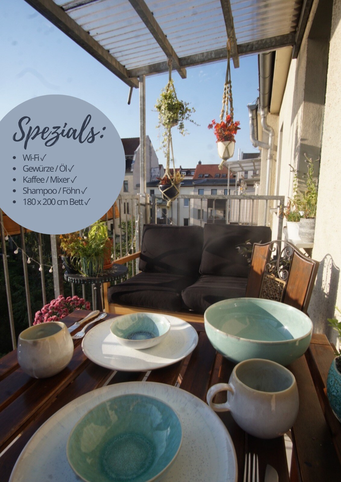 Apartmen dua bilik berperabot lengkap,tidak merokok, tingkat 1, 62m ²,dengan balkoni besar tambahan dengan meja,kerusi,payung + gril elektrik. Dapur dilengkapi dengan peti sejuk, peti sejuk beku, ketuhar gelombang mikro, cerek, pembuat kopi, pembakar roti, pinggan mangkuk,peralatan makan & beberapa rempah. Bilik mandi dengan tab mandi+pancuran mandi,jubah mandi, mesin basuh (dari 1Wo. percuma),pemanasan bawah lantai. Di ruang tamu terdapat TV SATELIT, PEMAIN DVD & sofa dengan fungsi katil. Bilik tidur dengan katil double & almari pakaian besar. Sewaan basikal atas permintaan.