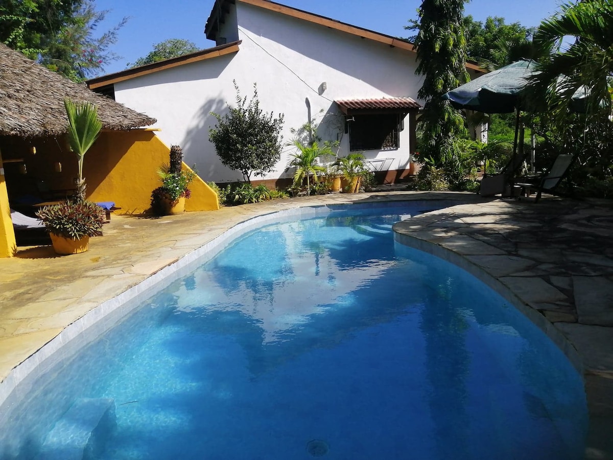 Rumah ini adalah khazanah di oasis hijau, yang terletak di taman tropika yang subur di bawah naungan baobab dan buluh besar, kolam renang persendirian yang dipenuhi dengan air laut separa jernih, katil matahari sedia membantu anda. Terletak di taman yang diselenggarakan dengan baik dengan pokok palma, kelapa sawit, pokok mangga, pokok gajus, pisang, kaktus, aloe veras, bougainvilleas, frangipanies dll. Rumah larangan parti