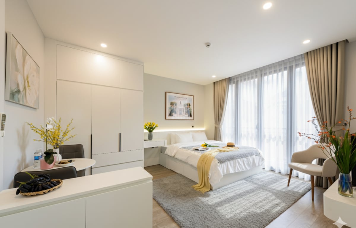 Gerbera The Montclair – Signature Studio with Balcony Boutique studio perfectly located near Hanoi’s Old Quarter and Truc Bach Lake. Enjoy abundant natural light, a private balcony, and a spacious bathroom featuring a relaxing bathtub. The apartment is fully equipped for both short and long stays. The building includes an artisanal café with daily fresh bakery, a rooftop garden terrace with sunset views, and 24/7 security for your peace of mind.