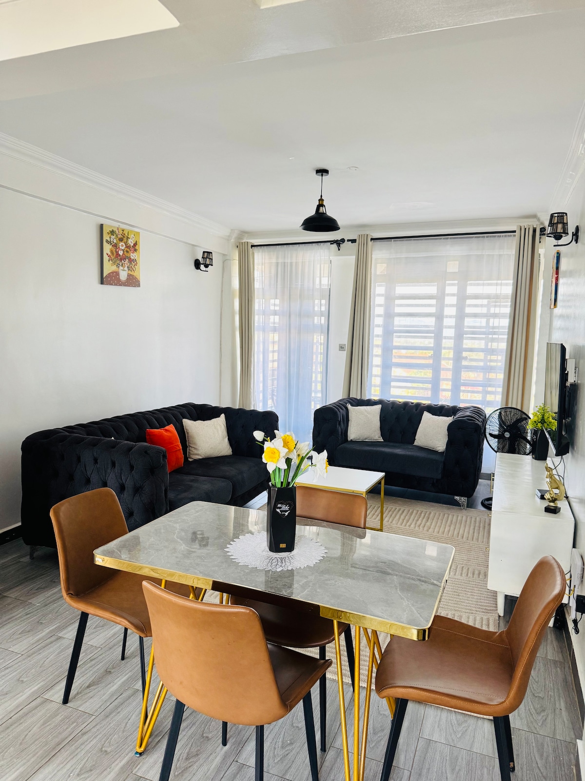 Selamat datang ke Lakeview Luxe Haven, percutian tenang anda yang terletak di tengah-tengah Milimani, Kisumu. Apartmen satu bilik tidur yang dilengkapi dengan perabot cantik ini menggabungkan keselesaan moden, pesona selesa dan keanggunan romantik — sesuai untuk pasangan, pengembara solo atau tetamu perniagaan yang mencari ketenangan dan gaya. Langkah masuk ke ruang tamu yang cerah yang menampilkan sofa 3 tempat duduk yang selesa, TV pintar dan lantai berkarpet lembut untuk anda berehat. Bersantai di bilik tidur yang selesa, dan balkoni dengan pemandangan. Semoga anda menikmatinya