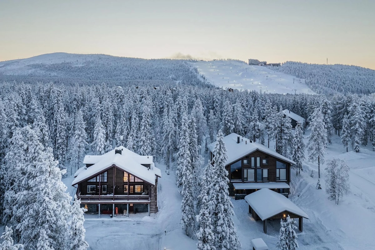 Rumah berkembar kayu balak yang baru siap dibina, penuh suasana dan berkualiti tinggi di cerun Ylläsjärvi. Lokasi tempat ini ideal untuk aktiviti luar: anda boleh pergi ke trek ski terus dari halaman dan lif ski terdekat terletak di halaman belakang (70m). Anda boleh meluncur terus ke halaman pondok ini dari lereng ski terpanjang di Finland! Terdapat juga laluan kasut salji dari halaman belakang ke Ylläs Fell. Anda juga boleh mengunjungi tempat ini tanpa kereta. Selamat datang untuk menikmati percutian yang tenang di tengah-tengah pemandangan yang indah.