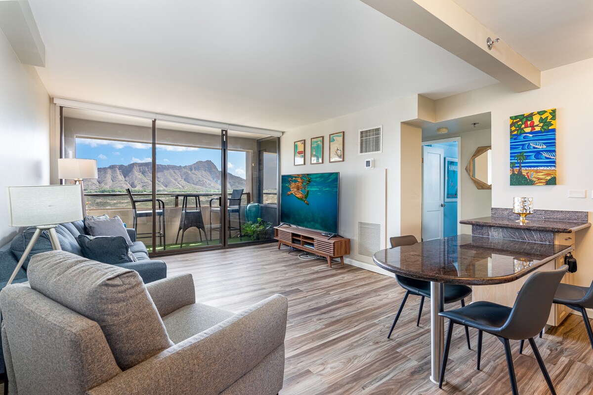 Aloha dan selamat datang ke percutian Waikiki moden anda! Kondominium kami yang telah diubah suai dengan cantik menampilkan pemandangan Diamond Head yang menakjubkan dengan sedikit pemandangan laut. Hanya kurang daripada 5 minit berjalan kaki ke pantai, kafe, Kedai ABC, sekolah meluncur, makan, dan membeli-belah. Nikmati tempat letak kereta PERCUMA yang selamat, Wi-Fi pantas, pendingin hawa pusat, akses ke kolam renang, gimnasium, kawasan BBQ dan dobi di tapak. Berehat di katil berkualiti hotel yang sangat selesa. Tuala pantai, papan skim, dan dua kerusi pantai disertakan 🌴✨