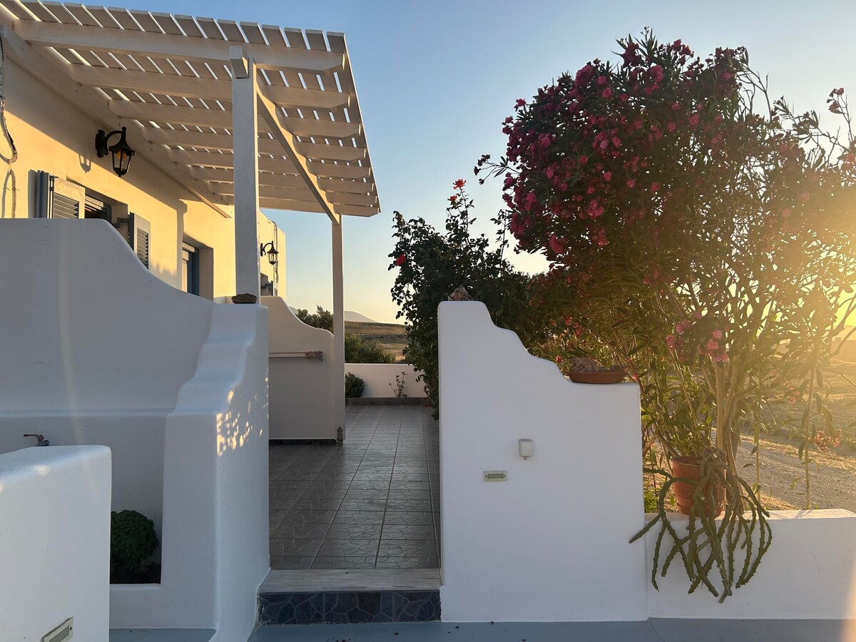Private, high-ceilinged farmhouse apartment with bedroom and bathroom. Special kitchen corner, preparation of breakfast & cold dishes. 2 balconies (40m2 in total), with a panoramic view of the port in front and the sea of Sarakiniko behind (the lunar landscape is only 15 minutes away on foot). Distances: 4 minutes from the port and 7 from the airport by car, Plaka: 5km, Pollonia: 7km, Fyriplaka-Tsigrado in 15 minutes. Recently landscaped garden, natural environment with privacy & tranquility