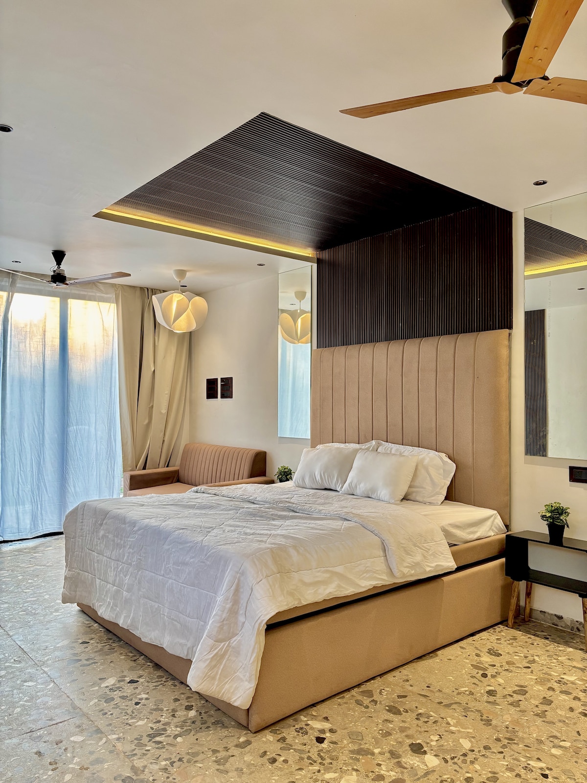 Nirja ialah vila bingkai A yang direka dengan teliti yang menampilkan katil king, katil loteng queen yang diakses oleh tangga kayu, dan bilik mandi ensuite yang elegan. Naik ke dek peribadi anda dengan pemandangan tanah ladang yang subur, atau berehat di tab mandi terbuka yang bersambung dengan bilik air - ruang yang menenangkan dan mewah untuk berehat dan berhubung semula. Dikelilingi oleh kicauan burung dan burung merak, Nirja menawarkan percutian yang tenang ke dalam ketenangan alam semula jadi.