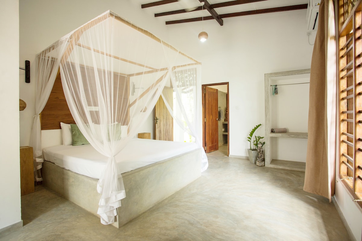 Vila menakjubkan dengan taman menghadap pantai berpasir yang tenang berhampiran Ambalangoda. Free AC, wifi, air penapis dan sarapan dengan buah-buahan, telur, roti bakar dan jem buatan sendiri. Chef dan houseboy yang tinggal di rumah perkhidmatan berhampiran sedia membantu anda. Katil king yang besar dengan tilam dan cadar berkualiti tinggi. Reka bentuk kontemporari Zen, tetapi dengan tingkap dan pintu antik, lantai konkrit yang halus dan gabungan perabot yang eklektik. Kolam renang infiniti ini mempunyai pemandangan yang menakjubkan di atas pantai dan lautan.