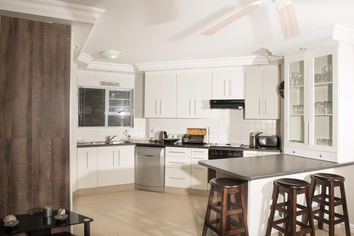Apartmen bergaya ini mempunyai pemandangan laut 180 darjah di dusun Seaview yang damai, 40 minit dari Addo Elephant Park dan 20 minit dari lapangan terbang. Dengan 2 bilik tidur, 2 bilik mandi, lounge, dapur, wifi gentian, DSTV, braai & kolam renang berkongsi. Lounge & 1 bilik tidur mempunyai pemandangan laut & dek di hadapan lounge untuk sundowners melihat lautan di seberang jalan. Kami mempunyai bekalan air selamat kami sendiri. Jiran Alan Tours menawarkan lawatan harian ke Addo & jiran lain Raggy Charters menawarkan perjalanan menonton ikan paus