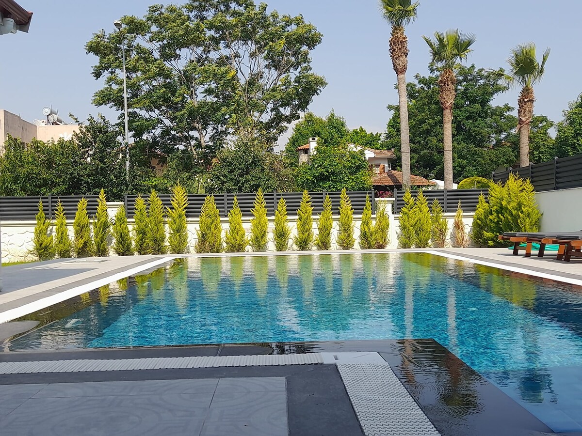 Vila kami menawarkan penginapan untuk sehingga 8 orang dengan pemandangan gunung yang unik, taman besar, seni bina asal dan lokasi pusat. Di vila kami, yang berjarak 50m ke sungai, 5 minit dari pusat Dalyan, anda akan bertemu pokok palma dan pemandangan gunung di taman dan kolam renang seluas 500 m2 yang sepenuhnya milik anda. Vila kami mempunyai kolam renang 30 m2 dan kawasan berjemur di taman kami. Dengan seni bina unik kami, kami boleh menyediakan kawasan peribadi dan umum di mana anda boleh meluangkan masa dengan senang hati.